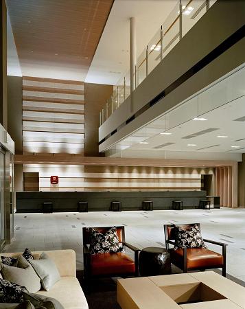 みどりのプロムナードに面するシンプルなファサードは、内部の機能を素直に開口部の大きさに出すことで、四つの層から構成されている。ポディウム部分を構成するPCの列柱はみどりのプロムナードのペーブメントや緑とよく調和し、その上には、シングルルームのフロアが11 層、ツインルームのフロアが3 層、バルコニーをもつ長期滞在型ルームが4 層が重なっている。1 階北側の車寄せから南の風除室を通ると、「サンルート有明」の広々とした2 層吹抜のロビーに導かれ、ガラスで仕切られた外部に広がる緑との一体感によってすがすがしさを演出している。車寄せから東側の風除室を通ると「ビーコンテ有明」のこじんまりとしたロビーに導かれ、住宅のスケールで構成されたインテリアは、安らぎと居心地の良さを感じさせる。 客室数は、3 階から16 階を占める「ホテルサンルート有明」の客室が790 室、17 階から20 階を占める長期滞在型ホテル「ビーコンテ有明」の客室が122 室、総数で912 室となり、サンルートグループでは最大のホテルとなっている。