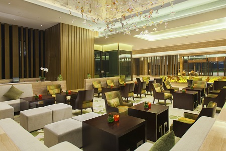 このホテルは、市の中心より15分ほどのロケーションのため、幸い喧騒からは離れています。この事もが揃っているため、リゾート性も併せ持つ施設としました。近くを流れる河岸からの自然環境との連続性を生かした「舟」をイメージしたデザインで、客室棟は象徴的な流れるような曲線をデザインとしています。また、エントランス棟は、格式をもった回廊式のデザインとしています。また、モダンチャイニーズをデザインテーマとした材質、色調で全体をまとめています。全体計画としては、全ての客室、料飲施設が大河を見渡せるよう配し、また、ホテルの前面には、リゾート性を生かす様大きな水景を用いています。この効果は、上記の「船」のイメージにも合わせ、水上に浮いたような効果を演出しています。